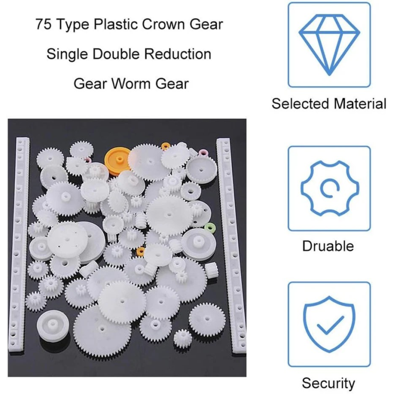 Estos engranajes de plástico de tipos diferentes facilitan el diseño de proyectos donde se necesite transmitir un movimiento giratorio o alternativo. Es ideal para la producción modelo de bricolaje, incluso diversión de utilizar y aprender, usando engranajes apropiados y piezas dentadas planas, puedes hacer movimiento alternativo necesario. Incluye engranajes helicoidales, engranajes de corona y un par de otros tipos, de diferentes dimensiones, engranes sin fin, poleas, barras dentadas (cremalleras) y bandas.