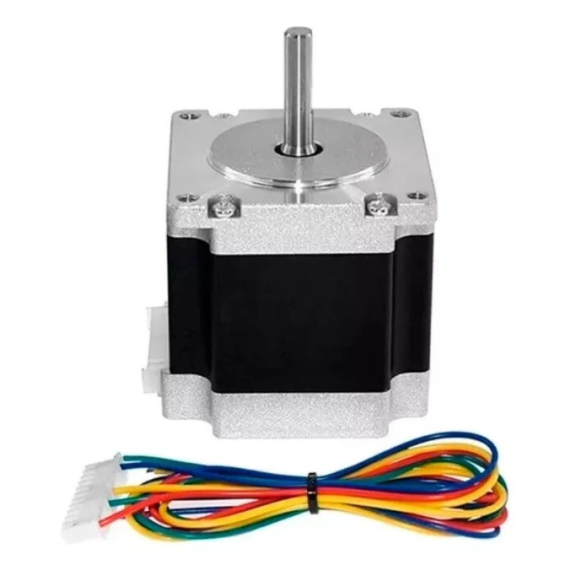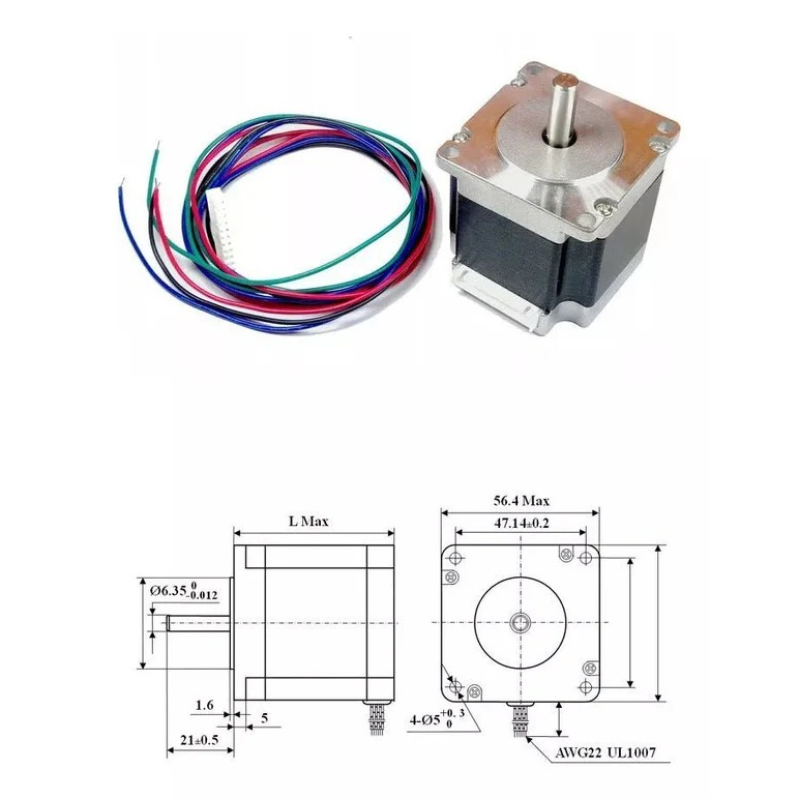 Nema 23 es un motor a pasos bipolar con ángulo de paso de 1.8 ° (200 pasos / revolución). Posee un eje tipo "D".