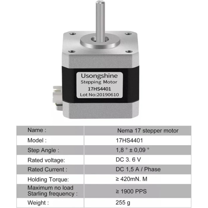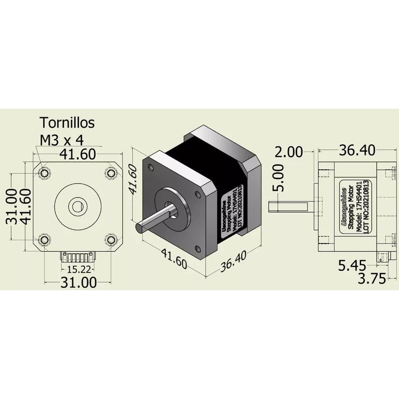 NEMA 17 es un motor bipolar, tiene un ángulo de paso de 1.8 º (200 pasos por vuelta) y cada bobinado es de 1.7 A ~ 12 V, capaz de cargar con 4 Kg / cm