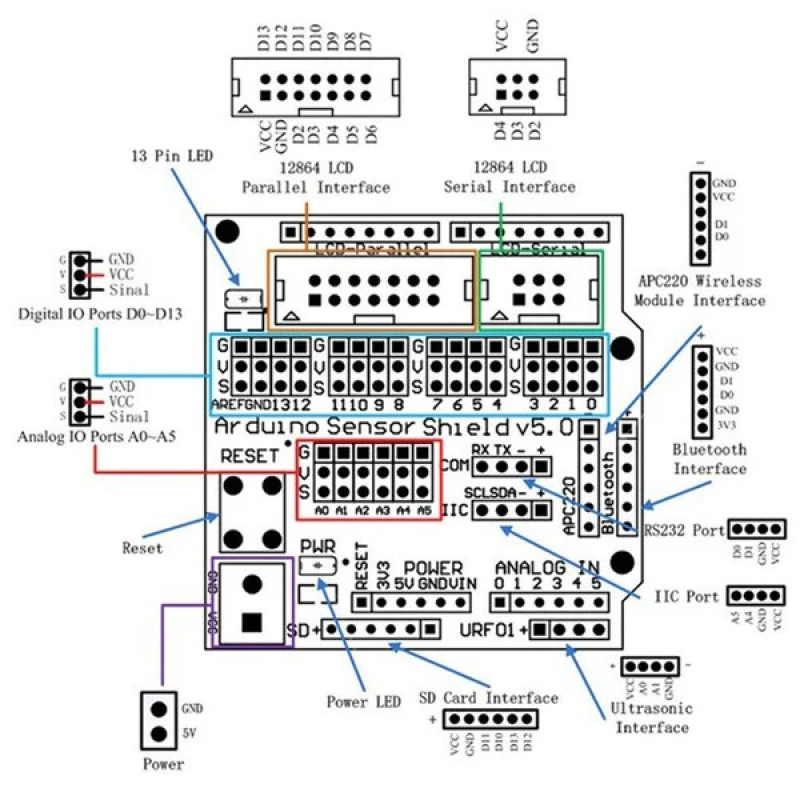 • Interface: 14 Puertos I/O 6 Puertos de entrada analógica; Puerto IIC. Puerto UART. Puerto para módulo bluetooth HC05 o HC06. Puerto para módulo SD card. Puerto para URF01+. Puerto 12864 para LCD (Serial y paralelo). Bornera para alimentación externa (servos)