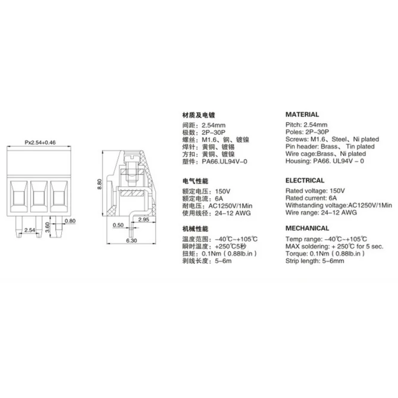 Terminal borne de dos tornillos con separación de 2.54 mm entre pines
