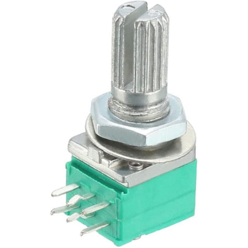 El potenciómetro de 100K ohms de 6 pines es un componente electrónico de tipo doble (dual/gang) diseñado para controlar dos señales simultáneamente,cuenta con dos potenciómetros internos sincronizados en un solo eje, permitiendo ajustar al mismo tiempo canales izquierdo y derecho, ideal para aplicaciones de audio estéreo.